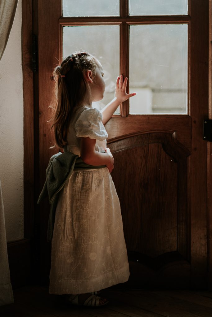 La journée commence par les préparatifs des mariés, partagés avec leur fillette. Ce sont des moments que j’aime tout particulièrement photographier, parce qu’ils racontent l’histoire de la famille dans ce qu’elle a de plus simple et de plus vrai. Un lacet à nouer, une robe que l’on ajuste, un câlin furtif… autant de détails qui comptent autant que les grands temps forts.