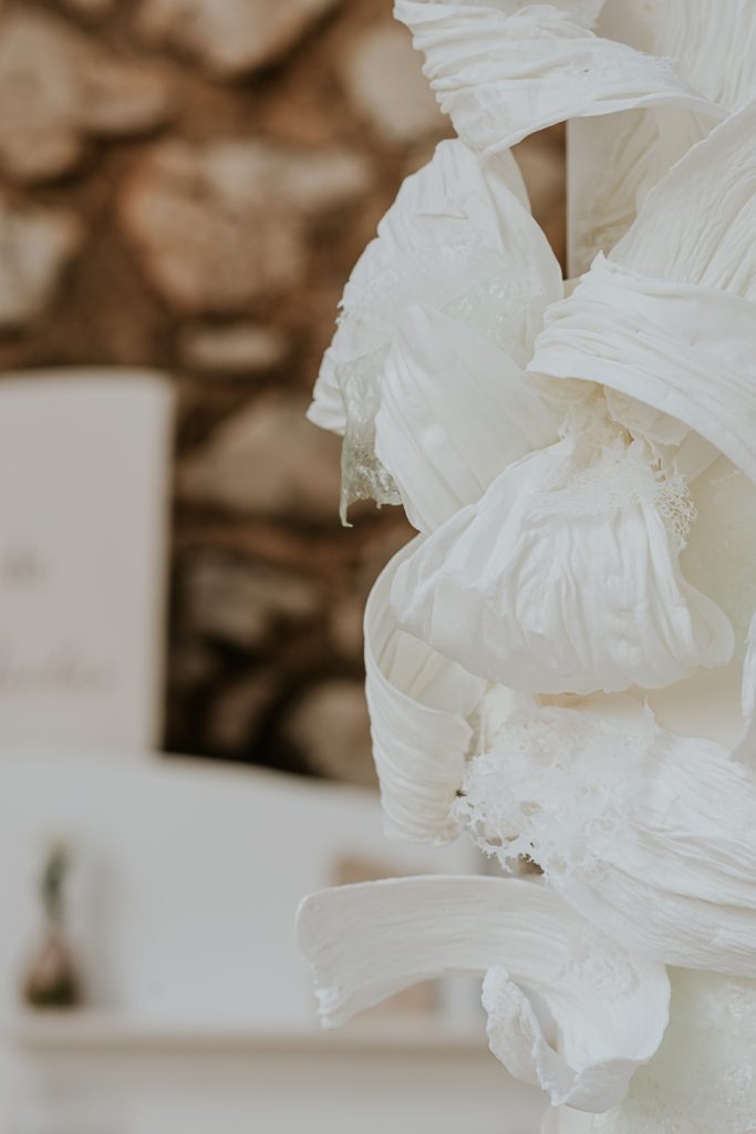 Le bouquet de la mariée, imaginé comme un sac porté en racines, faisait un clin d’œil très fort à l’élément terre. C’est un bel exemple de la façon dont la décoration peut sortir des codes traditionnels tout en restant très poétique. Le wedding cake, aérien et sculptural, venait lui aussi dialoguer avec les formes et les textures de la scénographie. Il ne faisait pas que “décorer” la table : il en faisait pleinement partie.