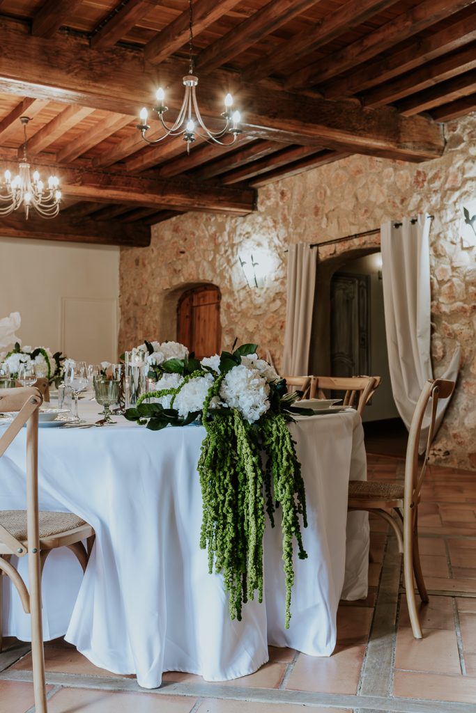 Ce que j’aime dans ce type de domaine, c’est la possibilité de vivre toute la journée au même endroit : préparatifs, cérémonie laïque, cocktail, repas et soirée. En cas de météo instable, la grande salle permet d’accueillir confortablement les invités tout en gardant une atmosphère chaleureuse. Ici, les mariés peuvent profiter de la nature sans renoncer à une solution de repli élégante, ce qui est précieux quand on se marie en Provence, où le vent peut parfois se montrer joueur.