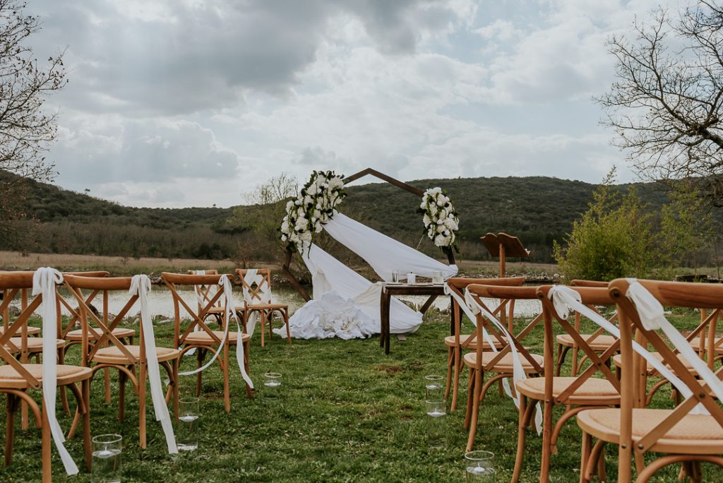 La cérémonie laïque était imaginée au bord du lac, dans ce décor de nature que le Domaine du Planet offre si généreusement. Le cadre était idéal : l’eau en arrière-plan, la végétation autour, une mise en scène épurée qui laissait toute sa place à l’émotion. C’est exactement le type d’ambiance que recherchent beaucoup de couples qui rêvent d’un mariage en Provence, avec une cérémonie à ciel ouvert.