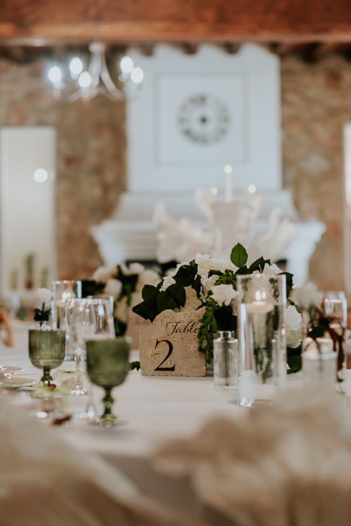 La salle de réception prolongeait la scénographie des quatre éléments, mais dans une version plus cocon, plus feutrée. Cindy a travaillé des matières naturelles : bois, travertin, fleurs stabilisées, papier crépon, racines disposées comme des lignes vivantes sur la table. La palette de couleurs restait douce et minérale, entre blanc, vert, beige et marron.